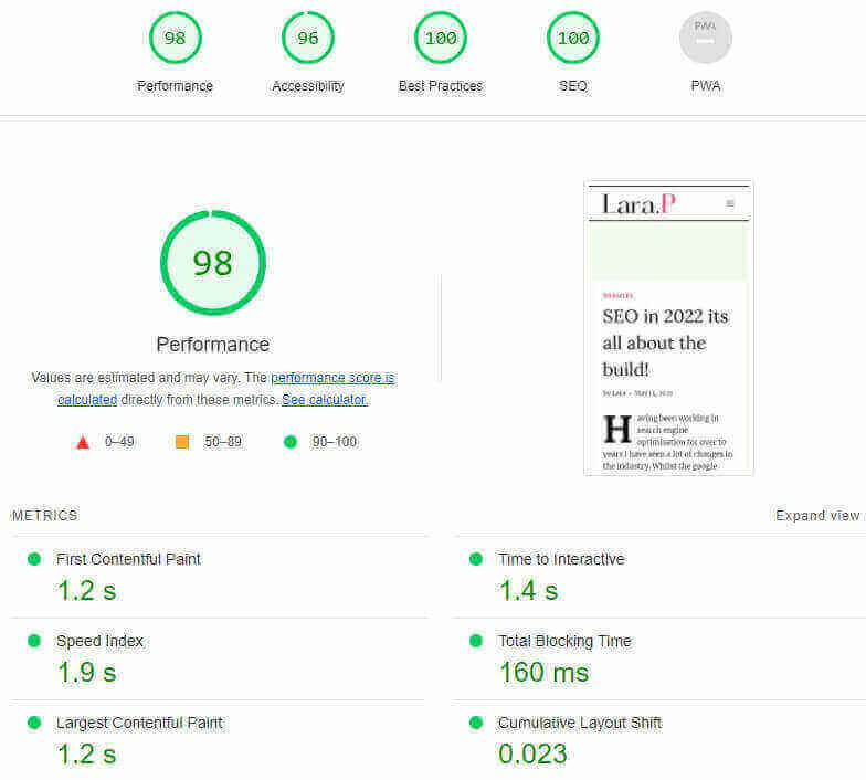 I have built LaraP Digital using Google’s best practices to hit core vital targets and provide an excellent page experience. You can check it for yourself using Google Lighthouse.